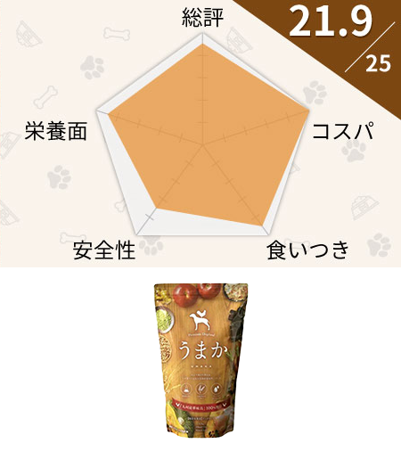 高級素材を厳選して作った国産ドッグフードのうまかは添加物ナシにもこだわり、小麦グルテンフリーの全犬種&全年齢対応になっています。獣医師もおすすめしている無添加ドッグフードなので、安全性や栄養バランスも良いのが特徴です。