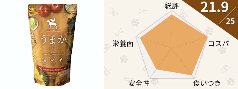 高級素材を厳選して作った国産ドッグフードのうまかは添加物ナシにもこだわり、小麦グルテンフリーの全犬種&全年齢対応になっています。獣医師もおすすめしている無添加ドッグフードなので、安全性や栄養バランスも良いのが特徴です。